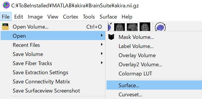 File→Open Volume...から〇〇.bse.nii.gzを選択します。