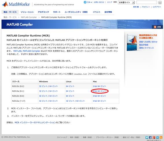 MathWorks社のホームページから、MCR_R2013a_maci64_installer.zipをダウンロードしてください。
