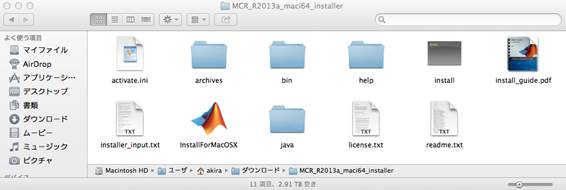 ダウンロード下のMCR_R2013a_maci64_installerフォルダに11個のファイルとフォルダが展開されます。
