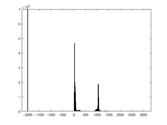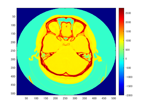 CTfolder='C:\Users\hashi\OneDrive\ドキュメント\MATLAB\CT';% CT DICOMのあるフォルダ CTfolder='E:\MATLAB\CT'; [V,spatial,dim]=dicomreadVolume(CTfolder); size(V) V=squeeze(V);% Vは4次元配列で1の次元を削除