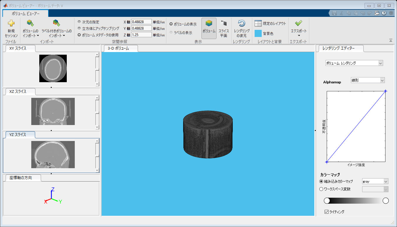 R2018bからimage processing toolboxにvolume renderingの関数volshowが用意されました。使ってみます。 どうもaxes上に表示されるのではなくuipanel上に表示されるのでdaspectやview関数は使えません。