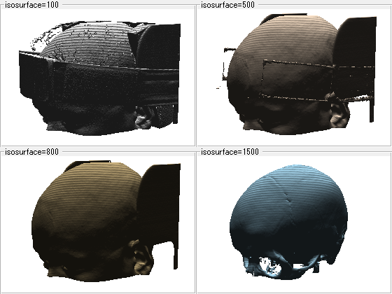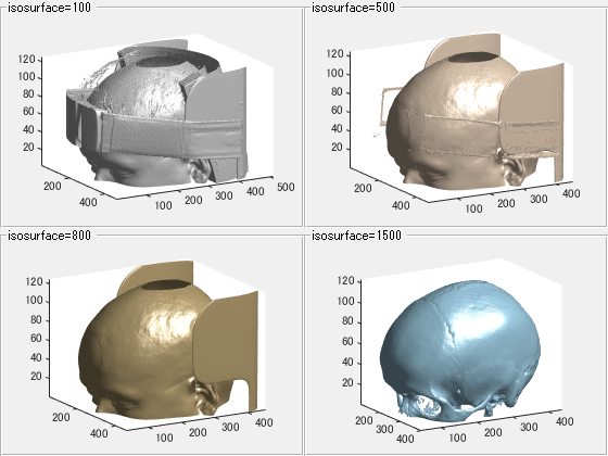 close all; hf=figure; for n=1:4 switch n case 1 value=100; isosurfacecolor=[1,1,1]*0.9;%白だとなんも見えん pos=[0, 0.5,0.5,0.5]; case 2 value=500; isosurfacecolor=[1,0.9,0.8]; pos=[0.5,0.5,0.5,0.5]; case 3 value=800; isosurfacecolor=[0.8,0.7,0.5]; pos=[0, 0, 0.5,0.5]; case 4 value=1500; isosurfacecolor=[0.7,0.9,1]; pos=[0.5,0, 0.5,0.5]; end tic; fv=isosurface(V,value); toc; label=sprintf('isosurface=%0.0f',value); hu=uipanel(hf,'position',pos,'title',label); axes(hu); p=patch(fv); p.EdgeColor='none'; p.FaceColor=isosurfacecolor; daspect(1./scale); view([60,15]);% 適当です! axis tight; camlight; lighting gouraud; rotate3d on; end