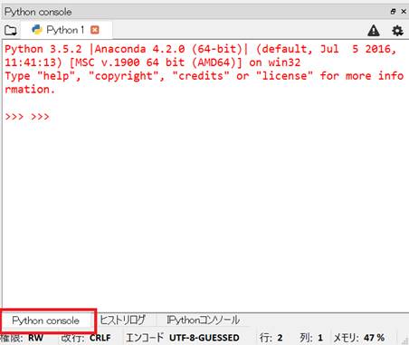 Spyderを起動します。IPythonコンソールではなくPython consoleを使うことにします。
