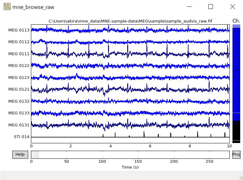 MNE-Pythonのtutorialのこの部分を試してみました。TutorialのPreprocessingの復習のような内容です。