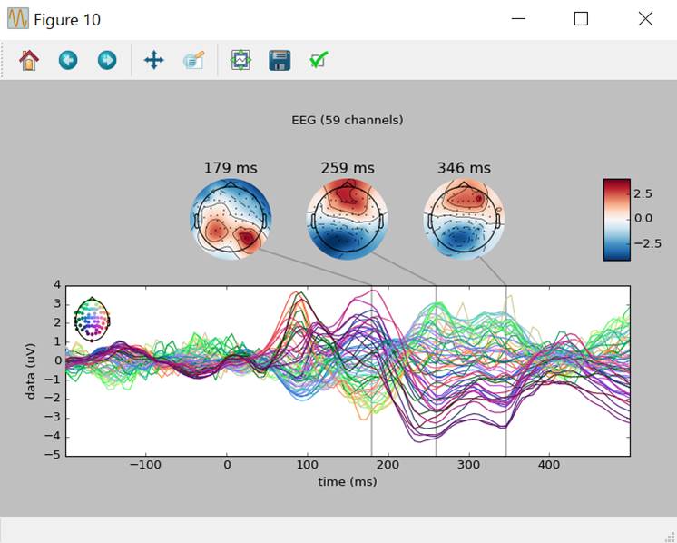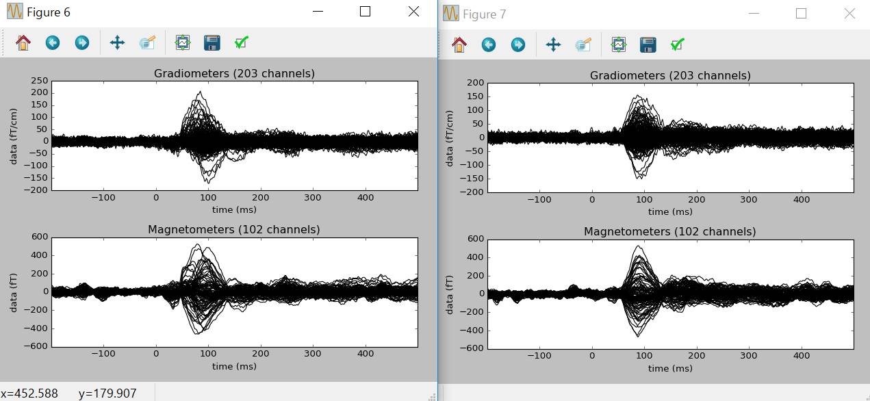 エポックの期間を-0.2〜0.3秒とし、-0.2〜0.0秒を基線とし、magnetometer>4×10-12、眼電図>200×10-6を除外した結果を表示します。